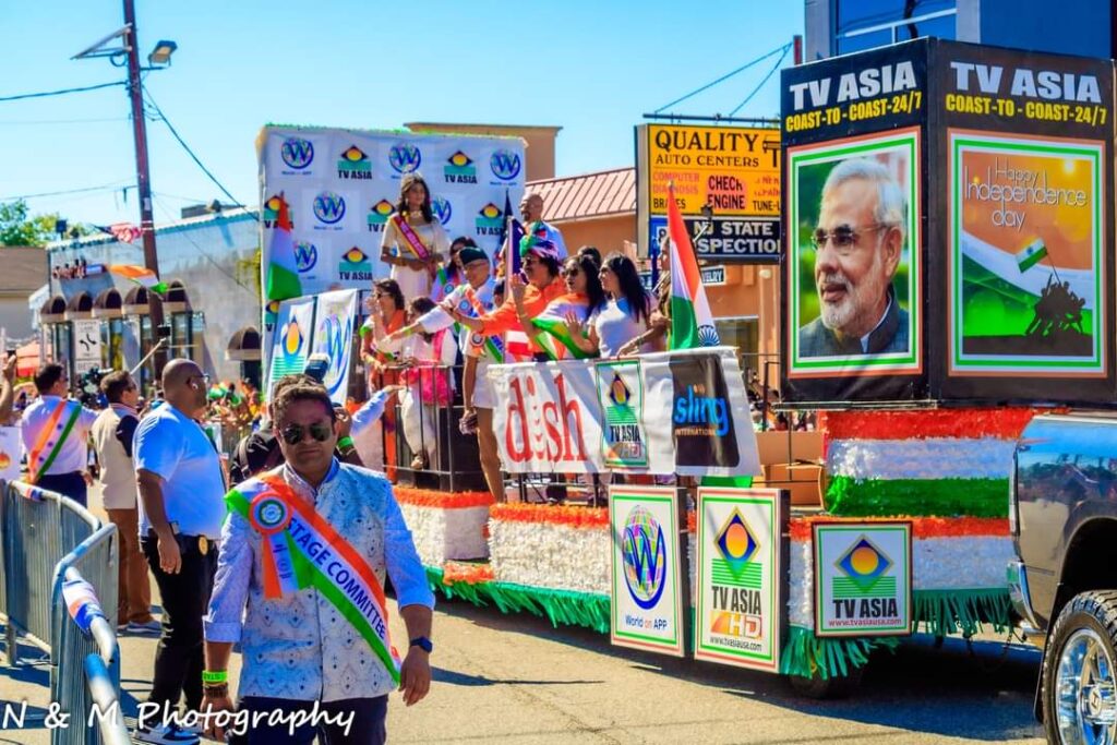 The parade was made colorful with floats by local businesses, including TV Asia, Diyacare, and others. The evening was celebrated near Marconi Plaza with an entertainment program where Chairman Chandrakant Patel, President Dhiren Amin, Vice Chairman Mahesh Mehta, and Manher Shah with community leaders addressed the audience.