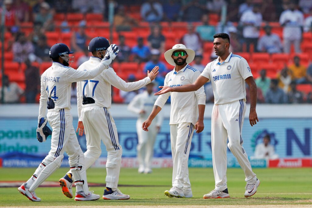 Ravichandran Ashwin celebrates the wicket of England’s Ben Duckett during Day 1 of 1st Test match, at Rajiv Gandhi International Stadium in Hyderabad on Thursday (ANI)