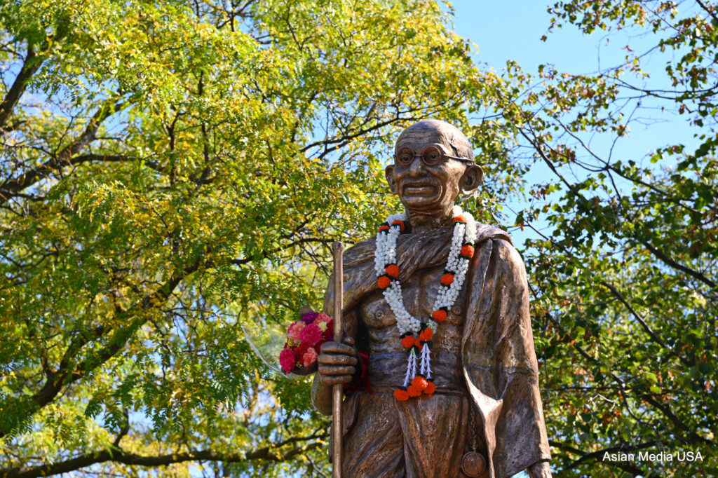 The members of Gandhi Memorial Foundation, Chicago celebrated Mahatma Gandhi Ji’s life on Gandhi Jayanti where the life-size monument of Gandhiji was located in the Heritage Park, Skokie, Illinois on October 02, 2023. Dr. Santosh Kumar, the President of Gandhi Memorial Foundation, Dr. Shriram Sonty, Vice President, Mr. Suresh Bodiwala, the Chairman, and Mrs. Dipti Shah, the treasurer of Gandhi Memorial Foundation along with invited guests, Somnath Ghosh, the Counsel General of India, George Van Dusen, the Mayor of Skokie and State Senator Ram Villivalam, Dist. 8, Mr. Prayag Raj, Vedic Acharya and over fifty elderly seniors and staff members from Metropolitan Asian Family Services, Chicago, Niles, and Schaumburg sites got together there to honor and to pay homage to the Father of our Country Mahatma Gandhi, Bapu, with great love, enthusiasm, and joy.