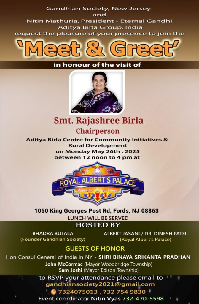 The Gandhian Society (USA) is proud to announce a special Meet and Greet event in honor of Smt. Rajashree Birla, Chairperson of the Birla Group, on Sunday, May 26, 2025, from 12:00 PM to 4:00 PM at Royal Albert Palace, New Jersey.