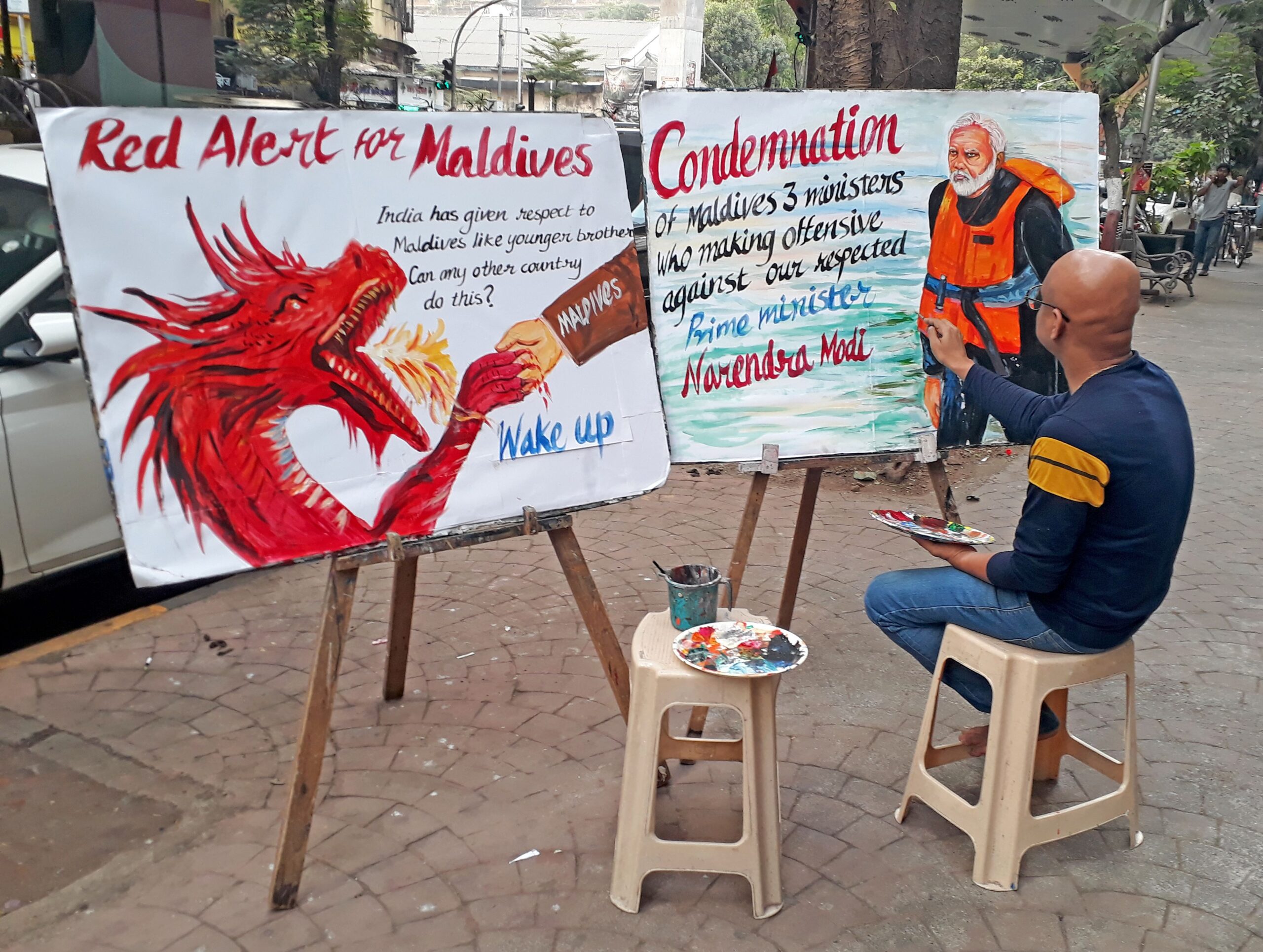 A Gurukul School of Art teacher makes a painting condemning Maldives over derogatory remark against Prime Minister Modi in Mumbai (ANI)