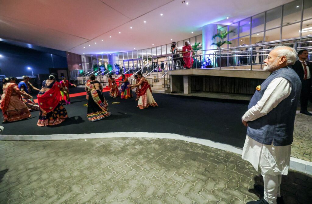 The highlight of the evening was a Garba-Dandiya performance by a group of Indian ladies led by well-known Kathak instructor Gyaneshree Karahe who also trained the group comprising Pooja Shah, Abha Joshi, Ramya Hegde, Jalak Modi, Mmahi Trivedi, Priya Dagia, Rajani Sinha, Sneha Prateek and Madhu Chauhan. The Prime Minister watched the entire dance which had variations of Garba and Dandiya. Praising the performance, Mr Modi engaged in a chat with the dance group before taking the steps into the hotel lobby where he was welcomed with the chanting of Vedic mantras by a Brazilian group led by Acharya Jonas Masetti ‘Vishvanath’.