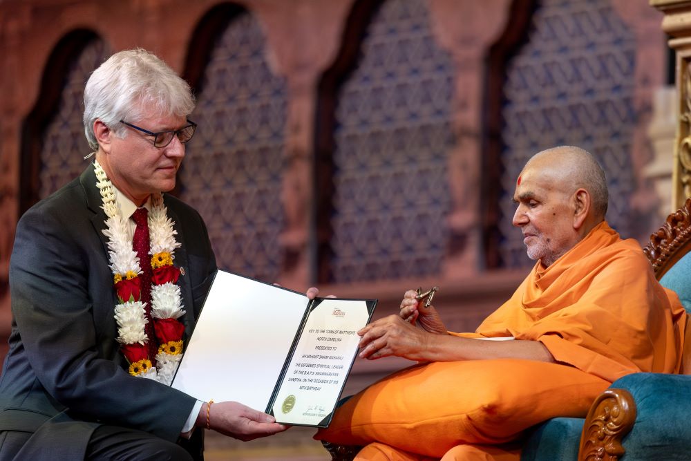 In recognition of BAPS’s contributions, His Holiness Mahant Swami Maharaj was honored with the “Key to the City” by Mayor David Fried of Robbinsville Township and Mayor John Higdon of Matthews, North Carolina.
