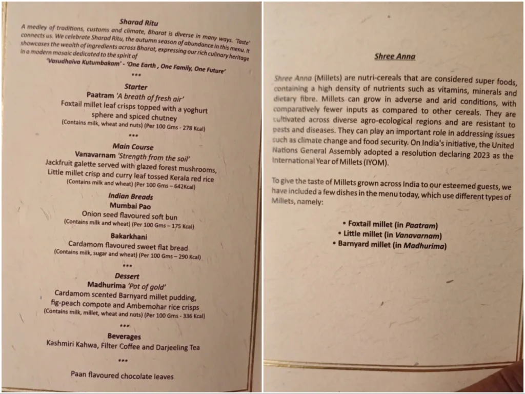 The menu was preceded by the idea behind the food which will be served and was titled ‘Shree Anna’. “Shree Anna (Millets) are nutri-cereals that are considered super foods containing a high density of nutrients such as vitamins, minerals, and dietary fibre. Millets can grow in adverse and arid conditions, with comparatively fewer inputs as compared to other cereals. They are cultivated across diverse agro-ecological regions and are resistant to pests and diseases,” stated a copy of the menu.