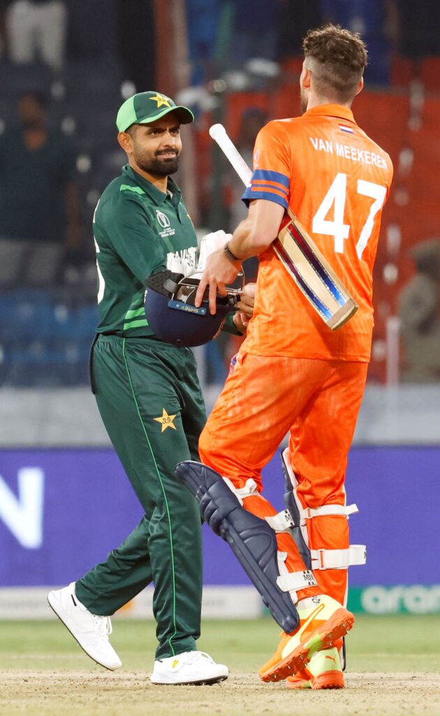 Pakistan’s captain Babar Azam and Netherlands’ Paul van Meekeren greet eachother after their match in the ICC Men’s Cricket World Cup 2023, at the Rajiv Gandhi International Stadium in Hyderabad on Friday (ANI)